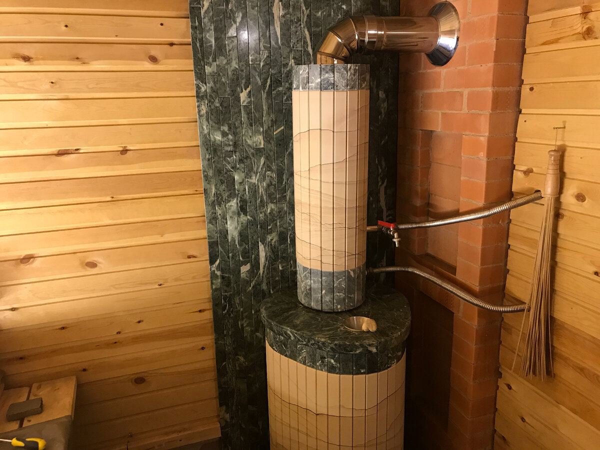- Установил на место банную печь и облицевал стену рядом с ней камнем.
