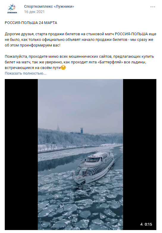 Матч стыкового турнира с Польшей перенесён из "Лужников" на "Динамо". Причина - "нестабильная эпидемиологическая ситуация в Москве и возможные связанные с этим ограничения". Это при том, что страны одна за другой отказываются от ограничений и даже мэр Москвы отменил обязательное ношение перчаток. Учитывая, что вместимость "Динамо" в три раза меньше лужниковской, спекулянты довольно потирают руки. О том, что мартовские матчи будут сыграны в Лужниках, стало известно вскоре после жеребьёвки. 11 декабря об этом спорткомплекс объявил на своей страничке в Вконтакте. И обратил внимание на билетных мошенников. Но уже на следующий день в интернете активизировались "он-лайн кассы" с "официальными" билетами по стоимости начиная с 2500 рублей. Интересно, сколько болельщиков приобрели такие билеты и что они собираются делать сейчас, после переноса матча в "Динамо"? Аферисты же переориентировались мгновенно. Билеты уже в активной "продаже" несмотря на слова РФС о том, что "информация об условиях пр