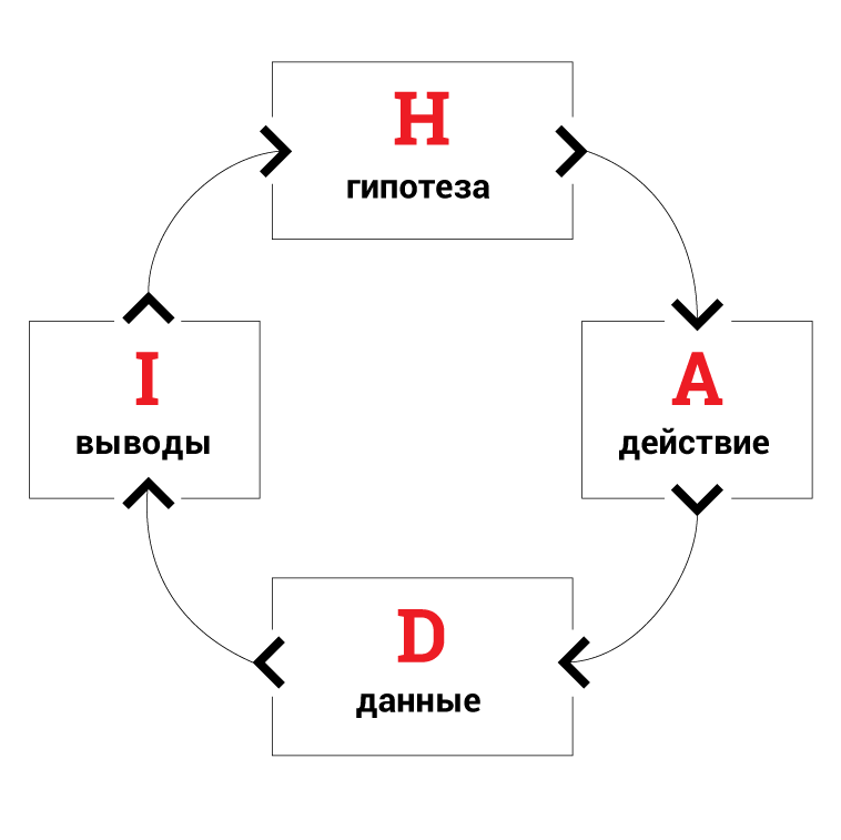 Что такое HADI Методология HADI представляет собой простейший алгоритм — от гипотезы через действие к данным и выводам. Цикл управления начинается с Гипотезы. Гипотеза (Hypothesis) На данном этапе выделяются ключевые показатели проекта, стартапа, бизнеса, маркетинговых смыслов. Создаются гипотезы по их проверке/улучшения. Этап понимания что влияет на результат. Формулировка гипотезы выглядит по принципу «Если …», «то …». Действие (Action) Необходимо провести ряд работ для запуска эксперимента. Что-то где-то изменить. Этап изменений. Аналитика (Data) На этом этапе происходит сбор данных за заданный период. Анализируются внесённые изменения по отношению к изменениям ключевых показателей. Этап сбора данных. Выводы (Insights) Получили результат → можно увидеть, насколько успешна гипотеза или нет. Сделать выводы. Повторить цикл заново. Этап так же называют интерпретацией. Как работает HADI Как ставить гипотезу? Гипотеза формируется из того, что мы хотим узнать, понять, изучить: Гипотеза ста