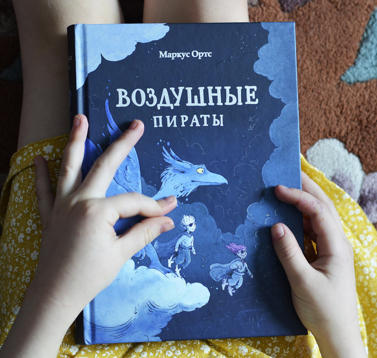 Эта странная фраза появилась у моей 6-ти летней дочки совсем недавно. Я ей читала книгу издательства «Поляндрия» «Эффект Матильды» Элли Ирвинг. Нас так захватила эта история, что мы ее прям «проглотили» за несколько дней. А это объемное издание – 320 страниц сплошного текста без иллюстраций! Как только мы закончили читать Элли Ирвинг «Эффект Матильды» дочка схватила следующую новинку издательства «Поляндрия» - «Воздушные пираты» Маркуса Ортса. И снова: «Читай скорее, я сейчас сдохну!» А это тоже большая книга – 256 страниц, но уже с рисунками! И перед чтением дочка внимательно все посмотрела и ее очень заинтересовали странные человечки с повязками на глазах и с крылышками на ногах. Человечки с крылышками на ногах – воздушные пираты, и живут они в небе. Они злобные, крикливые и любят спорить. И вот однажды у одного из пиратов появляется редкий ребенок – белокожий воздушный пират, добрый, заботливый и миролюбивый. По законам воздушных пиратов такое дитя надо уничтожить… Дочке очень понра