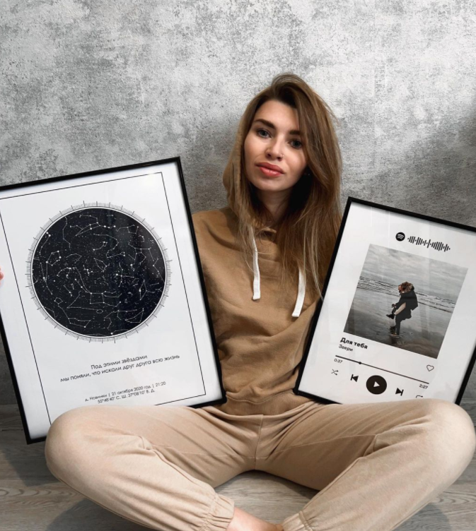 Первый (большой постер) - проекция звёздного неба с созвездиями в определенную для меня ночь, время и место. Это первый день наших отношений и ровно тот час на свидании, когда нам обоим стало понятно, что нам суждено быть вместе (мы очень быстро это поняли, с первых секунд контрактного общения).
