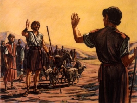 д. Жизнь в Харране. В Харране Иаков встречается со своим дядюшкой Лаваном, таким же пройдохой, как и он сам. Дядюшка обманным путем женит Иакова сначала на своей старшей дочери, Лии, прекрасно зная, что от его другой дочери, Рахили, тот все равно не откажется, потому что влюбился в нее с их первой встречи у колодца. Двадцать лет прошли на чужбине. И вот, наконец, обладая уже большим состоянием и многочисленной семьей, он обращает свой взор к родительскому дому. Приблизившись к восточным границам Ханаана, он узнает, что Исав движется навстречу ему с четырьмястами воинами. И снова призраки его собственных грехов и мести брата встают перед ним. Его душа сломлена чувством слабости и никчемности. Стадо за стадом, отправляет он дары впереди себя, чтобы умилостивить Исава. Семья переправляется через реку Иаков. Иаков остается один в Пенуэле. Там он борется всю ночь с загадочным посланцем Господа. Наконец, тьма рассеивается, наступает день. Своенравный Иаков уступает, и только тогда он получает желанное благословение, и Иаков-хитрец превращается в Израиля.