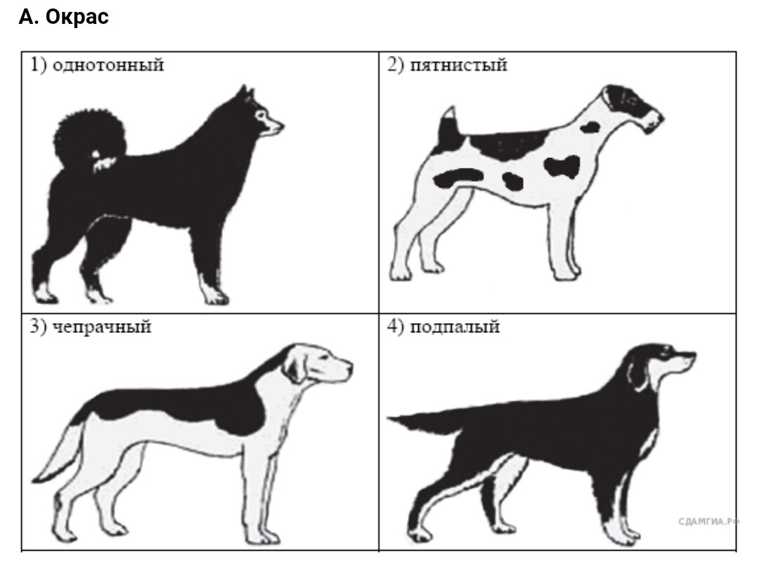 За 24 задание дают 3 балла. И это не самое сложное задание! Но что нужно сделать для того,чтобы стать из обладателем? Сегодня об этом и поговорим. 24 задание В каждом варианте оно разное,но по сложности одинаковое. Возьмем 24 задание из рандомного варианта. Посмотрим на предлагаемые ответы. Нужно определить окрас собаки исходя из картинок выше. Здесь определяем форму головы нашей собаки. Определяем форму ушей. А потом и форму хвоста. Ответы нужно внести в таблицу: 1 делом... Давайте найдем нужный окрас. Пятнистый точно неподходящий. Чепрачный тоже не то. Скорее всего подпалый. 2 пункт... Посмотрим на нашу собаку. Давайте определим ее форму головы. Точно не 3 и не 4. Думаю 1. 3 пункт. Определим форму ушей. Не стоячие,а полустоячие. 4 пункт Высокое0 5 пункт Теперь форма хвоста. Нам подходит прутом. Впишем ответы в таблицу: Итог Конечно задание не из легких,но и сложного здесь ничего нет. Не пугайтесь его! Оно вам даст целых 3 балла!