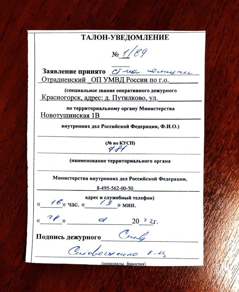 КУСП № 781 ТАЛОН – УВЕДОМЛЕНИЕ № 1/89, заявление принято в 16 часов 19 минут , января 28 , 2022 года , ОБЕСПЕЧИТЕЛЬНЫЕ МЕРЫ ВКЛЮЧЕНЫ С МОМЕНТА ПОДАЧИ ЗАЯВЛЕНИЯ!