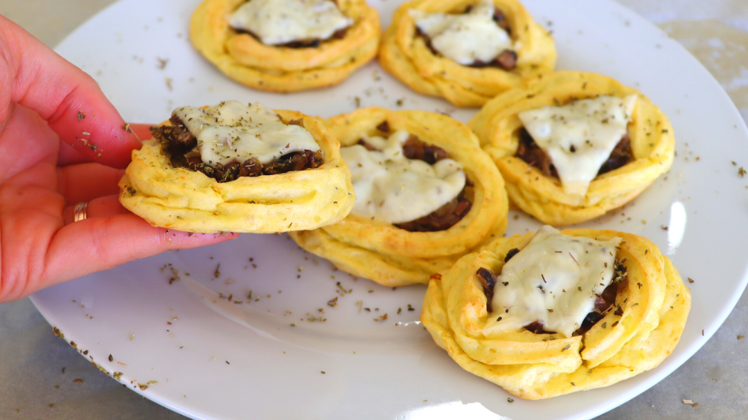 Делюсь обалденным рецептом из картошки. Ингредиенты: картофель , яйцо, соль, масло оливковое, шампиньоны, лук, сыр, чеснок, масло для жарки Способ приготовления: 1. Отварить картофель. Сделать из картофеля пюре, добавить масло и яйцо. Перемешать. ВИДЕО РЕЦЕПТ ТУТ 2. Мелким кубиком порезать лук и шампиньоны. Чеснок разрезать пополам. Обжарить на масле с чесноком сначала лук, а потом шампиньоны до золотистости. Добавить соль и перец. 3. Переложить пюре в кондитерский мешок. Выложить на противень с бумагой в виде тарталеток с бортиками. Отправить в духовку на 210 гр до золотистости. Достать, разложить грибную начинку и посыпать сыром сверху. Запекать до расплавления сыра