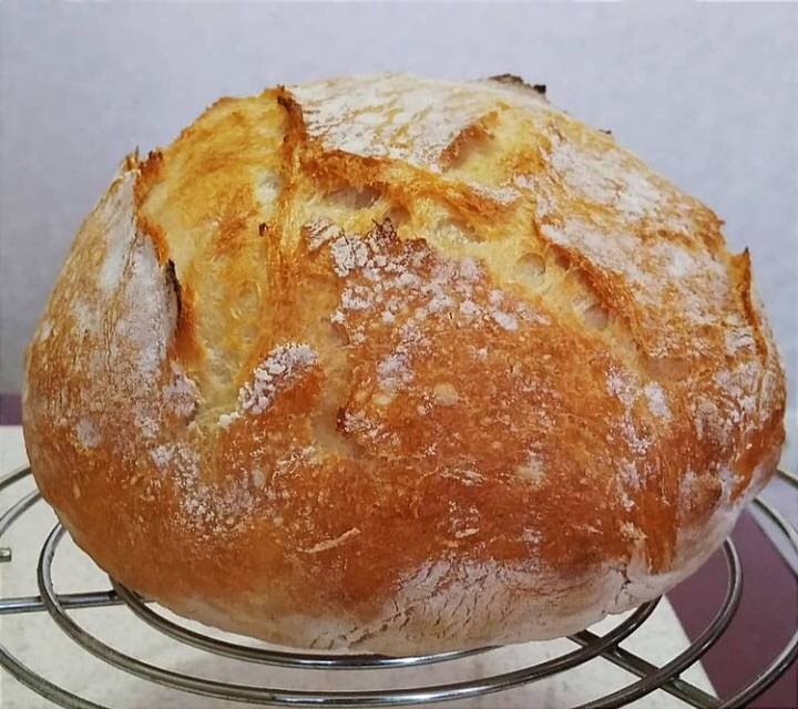 Ароматный хлеб с тонкой хрустящей корочкой и великолепным вкусом! Ингредиенты: вода, сухих или 5 г - живых дрожжей, мука пшеничная, соль Способ приготовления: Муку просеять и смешать с солью. Дрожжи растворить в чуть тёплой воде. Влить воду с дрожжами в муку и быстро перемешать ложкой. Получается липкая густая масса. Долго не мешать. Накрыть и оставить при комн. t° на 12 часов. Я замешиваю на ночь и утром выпекаю. За 12 часов тесто всё в пузырьках. Не перемешивать! Духовку заранее, за полчаса до выпечки хорошо разогреть до 250°, а также нагреть до горячего состояния кастрюлю с толстыми стенками и крышку(у меня обычный казанок). Нежно переложить тесто на подпыленную мукой поверхность. Немного распластать руками и сложить конвертом, стараясь сильно не мять. Осторожно поместить тесто в горячую кастрюлю, дно которой немного присыпано мукой. Накрыть горячей крышкой. Поставить в духовку. Убавить t° до 220°, выпекать 30 минут под крышкой, затем без крышки ещё 15 минут. Остудить готовый хлеб н