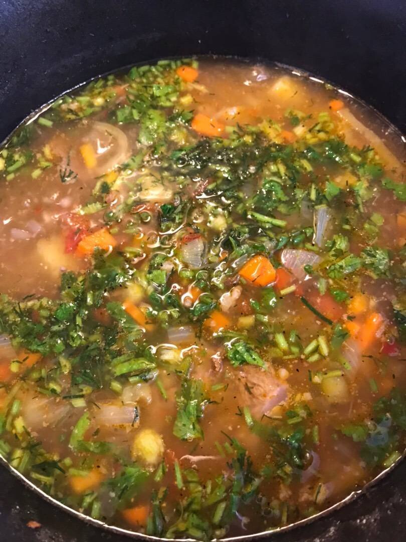 #рекомендую #шурпа #говядина. Готовила на плите, не в мультиварке. Времени затратила много , т.к готовила шурпу на говядине. Овощи не жарила, покрошила кубиком. Ингредиенты: говядина (мясо и на кости) , картофелины, луковица, морковь, болгарский перец, помидор, морской соли, лавровых листа, сельдерей, сухого чеснока, кинза, укроп Способ приготовления: В кастрюле с толстым дном ставим варить мясо. Снимаем накипь и варим 1,5 часа. Затем мясо вынимаем и нарезаем на кусочки. А в бульон отправляем овощи: лук, морковь, брусочек тертого замороженного сельдерея, болгарский перец-часть заменила на сушеные хлопья. Варим овощи 15 минут. Сюда же возвращаем мясо вместе с мослом. Добавляем порезанный покрупнее картофель, соль и лаврушку. Варим ещё 15 минут. Затем кладём покрошенные помидорки. Варим 10 минут и посыпаем шурпу порезанной зеленью кинзы и укропа, а так же чесноком. Я свежий чеснок заменила сухим, чтобы не было резкого вкуса. Варим пару минут и выключаем. Даём шурпе немного постоять и под