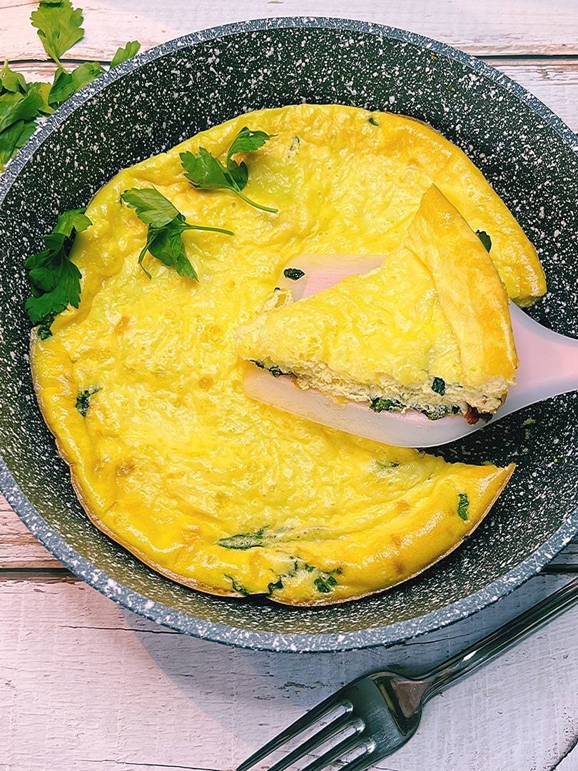 Ингредиенты: яйцо, сливки 20% , сливочное масло , красная луковица (по желанию), шпинат свежий, вяленые помидоры, тёртый пармезан, тёртый сыр Способ приготовления: Для приготовления возьмите сковороду, которую можно использовать в духовке. Ингредиенты рассчитаны на сковороду d24. Духовку разогрейте до 180 градусов. В миске взбейте венчиком яйца и сливки. В сковороде, пригодной для духовки, растопите сливочное масло на среднем огне. Добавьте мелко порезанный лук, готовьте 4-5 минут до мягкости лука. Затем добавьте мелко нарезанный шпинат и вяленые помидоры, поперчите. Готовьте 2-3 минуты, снимите с огня. Разровняйте овощи, посыпьте их 2/3 сыра и залейте яичной смесью. Затем посыпьте оставшимся сыром. Выпекайте примерно 15 минут, пока фриттата не станет золотистого цвета. Фриттата готова, если края отходят от сковороды. При подаче посыпьте зеленью.