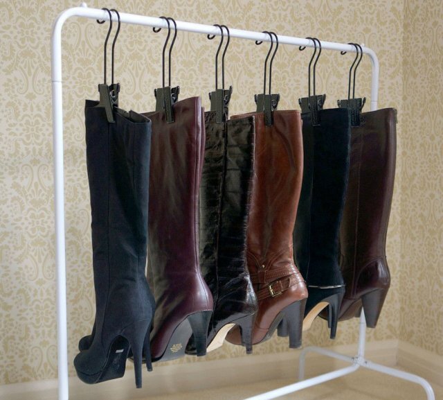 1. Как организовать хранение зимней обуви Чтобы сапоги с высокими голенищами не занимали половину прихожей, сделайте для них вешалку с зажимами, как показано на фото. Правда, для малогабаритного помещения такая конструкция не очень подойдет. В таком случае в каждый сапог поместите пустую бутылку или свернутый лист ватмана, чтобы они стояли прямо и занимали меньше места. 2. Как организовать хранение платков и палантинов Чтобы быстро находить нужный платок и держать аксессуары в должном порядке, купите или сделайте своими руками вешалку с отверстиями. Отверстия могут быть небольшими – для тонких шейных платков или довольно широкими – для палантинов. Компактная вешалка не займет много места в шкафу, а при желании ее можно повесить просто на настенный крючок. 3. Где хранить зимние шапки и шарфы Зимние шапки и шарфы занимают много места и часто так и норовят упасть с полки шкафа-гардероба. Чтобы было проще их хранить, сделайте из старого ящика пуф с крышкой и мягким сиденьем. Внутрь вы смо