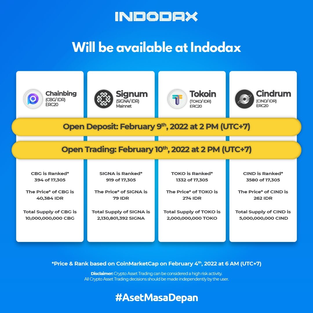 На этой неделе индонезийская биржа Indodax проведет листинг 4х криптоактивов CBG; CIND; TOKO; SIGNA