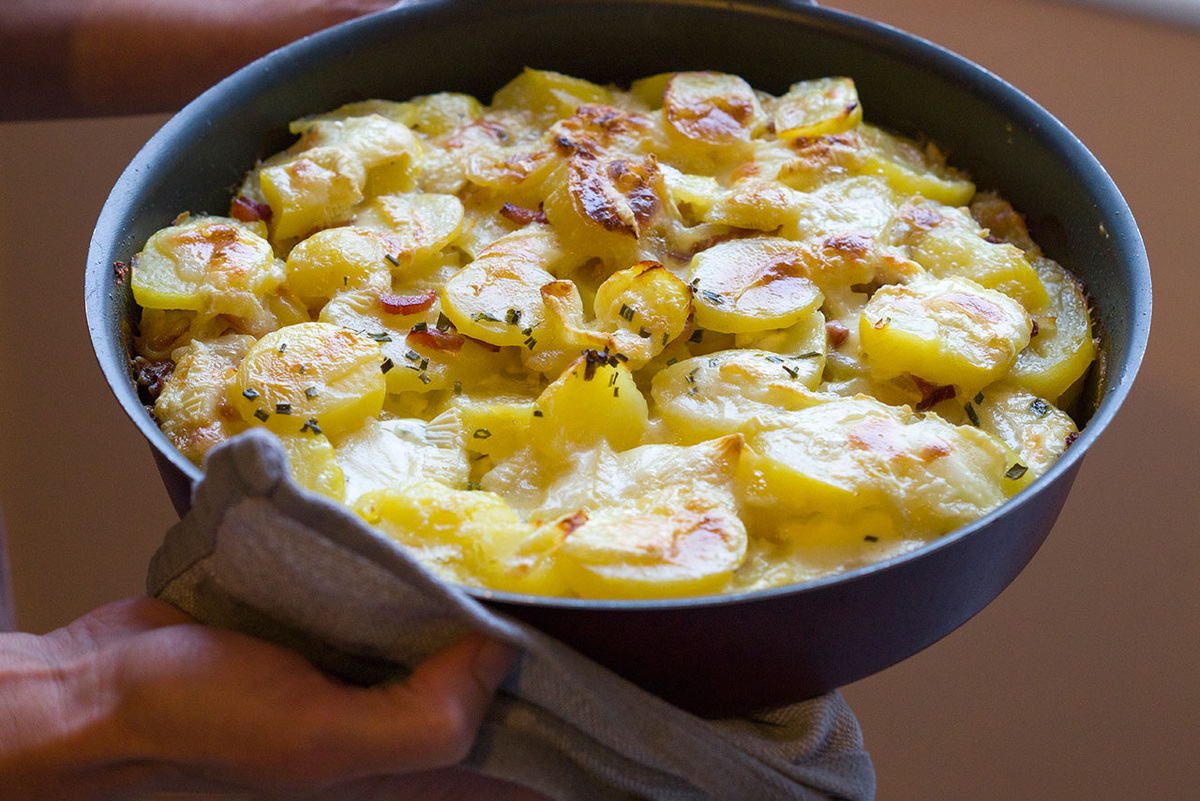 Многие блюда французской кухни имеют поистине интернациональный масштаб. Потому что просто, ароматно и вкусно. И сытно, конечно. В русском языке привычные нам слова суп, котлета, омлет, майонез и ресторан имеют французские корни. Так, тартифлет – на слух что-то изысканное, а на деле – знакомый всем картофель под сырной корочкой. Блюдо, отлично подходящее для зимних обедов, когда хочется согреться и насытиться. Картофель по-французски с мясом – нет, это не тартифлет! Это как раз, как утверждают некоторые историки кулинарии, адаптация французской кухни под русскую действительность. Так в чём же секрет картофельно-сырной запеканки тартифлет? Кулинарная история блюда тартифлет Tartifla – на одном из французских диалектов, собственно, картошка, всемирно известная и любимая всеми народами, благодаря Христофору Колумбу. Первое упоминание тартифлета встречаем в XVIII веке в книге королевского повара Франсуа Массиало. А вот популярности блюдо набрало уже в середине 80-х XX века, ко