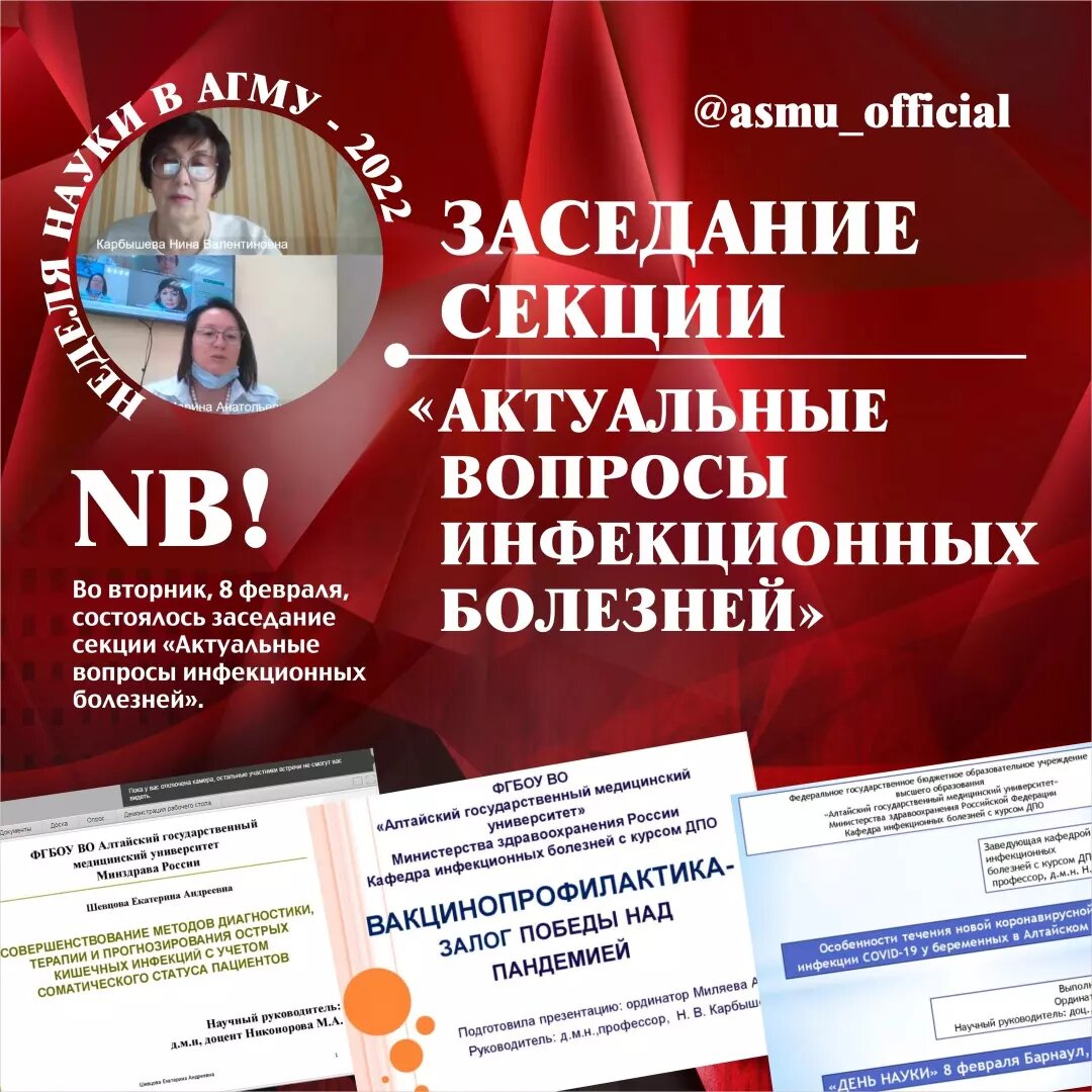 "Неделя науки-2022" в АГМУ: заседание секции "Актуальные вопросы инфекционных болезней" . В Алтайском государственном медицинском университете стартовала традиционная "Неделя науки". . NB! В связи с эпидемиологической ситуацией все мероприятия проходят в дистанционном формате. . Во вторник, 8 февраля, состоялось заседание секции «Актуальные вопросы инфекционных болезней».' . В работе секции приняли участие около 100 человек: сотрудники и ординаторы кафедры, студенты института клинической медицины и факультета иностранных студентов. . С приветственным словом в адрес участников и слушателей обратились эксперты секции: заведующий кафедрой инфекционных болезней с курсом ДПО, профессор Карбышева Н.В., профессор кафедры Никонорова М.А., доцент Матрос О.А. . С докладами выступили сотрудники, молодые ученые, ординаторы кафедры инфекционных болезней с курсом ДПО. Все доклады включали наиболее значимые вопросы инфекционной патологии, результаты Госзадания и диссертационных исследований. Т