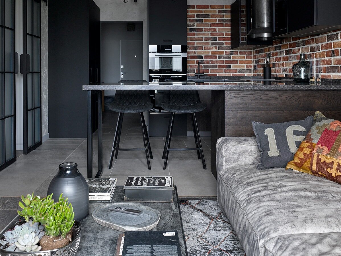 Неординарный интерьер, в котором нашлось место кирпичным стенам, плиткам в стиле уличной росписи «banksy», лаконичной мебели и декору из старого дерева, создала Анастасия Уфимцева для владельца квартиры в столичной новостройке. Заказчик приобрел квартиру в новой панельной многоэтажке на юге Москвы, однако сразу отметил: ему хотелось бы получить пространство «с историей», нетривиальное и интересное. Дизайнер предложила взять за основу стиль лофт с его брутальной выразительностью, соединением кирпича и бетона, грубоватыми поверхностями и ироничными деталями. Планировка затронула лишь часть помещений, но помогла сделать квартиру максимально функциональной. В общественной зоне мебель и декор позволили визуально выделить гостиную и кухню. При этом зоны объединяет единая отделка стен в виде декоративного кирпича и штукатурки с эффектом старения. Кухонная мебель приковывает к себе внимание эффектной фактурой – грубоватый тонированный шпон дуба сочетается с гладкими фасадами темно-графитового