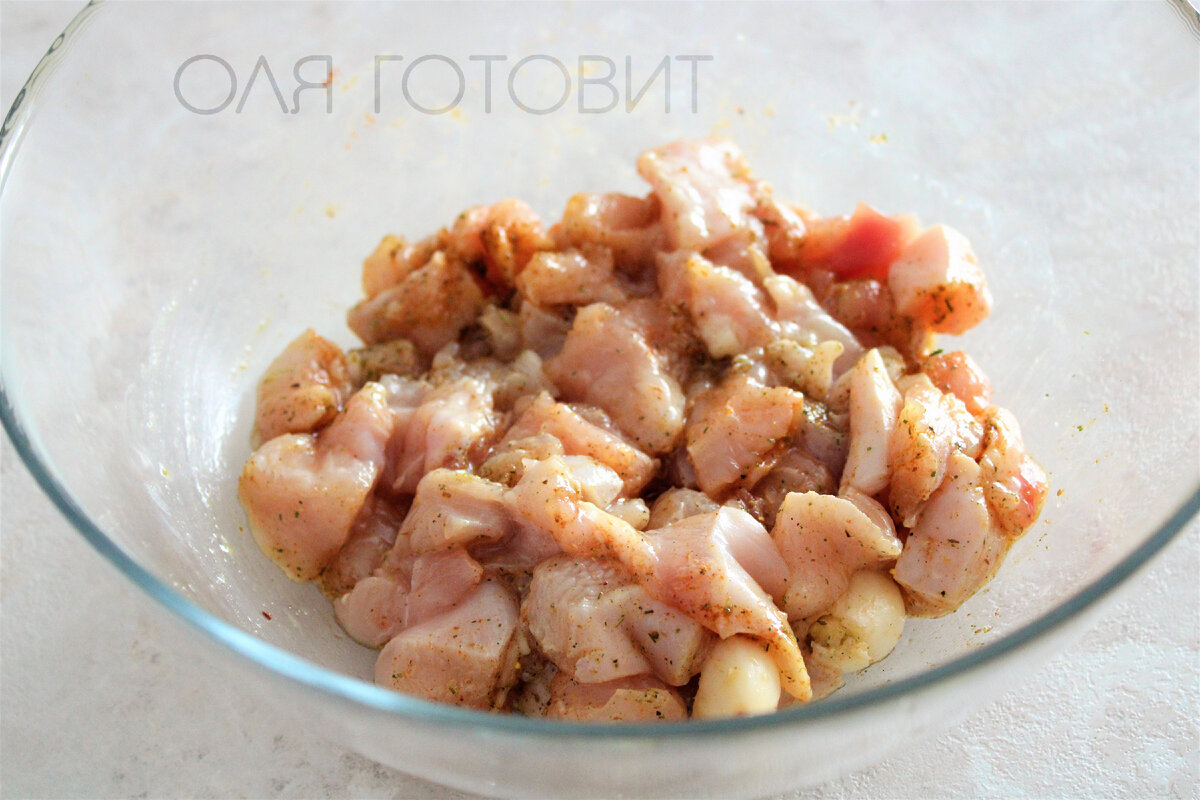Возможно многие уже знают и готовят этот салат, но я его попробовала впервые совсем недавно. И он на столько понравился мне и моим родственникам, что однозначно занял почетное место среди наших фаворитов. Особенно он нравится мужчинам, хорошее сочетание продуктов и чесночные сухарики делают свое дело. Для начала нужно подготовить курочку. Я использую куриную грудку, режу ее небольшими кубиками и отправляю в чашу. Ее необходимо замариновать. Туда же отправляется и соль, сушёная паприка, немного хмели-сунели, несколько долек чеснока и растительное масло. Все хорошо перемешиваем и оставляем хотя бы на час в кухне на столе. Далее мясо нужно обжарить на сковороде. Если у сковороды хорошее антипригарное покрытие, то и масло можно не добавлять. Мясо обжаривается буквально 15 минут, главное его не пересушить. Очень вкусно в этот салат добавлять сухарики, но не обычные, а чесночные. Их можно купить в магазине, но лучше приготовить самим. Для этого несколько кусочков хл