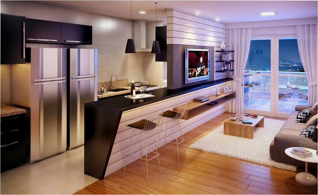 Современным направлениям в дизайне свойственна простота и функциональность. В особенности это касается небольших помещений, где каждый сантиметр на счету. Например, в квартире-студии нет смысла размещать громоздкий обеденный стол, и можно обойтись барной стойкой. Однако компактность данной конструкции – далеко не единственный аргумент в ее пользу. Зонирование помещения Ключевой особенностью квартиры-студии является открытая планировка. И нередко она не особо располагает к уюту, в особенности, если жилье имеет нескольких хозяев. Барная стойка – отличный способ зонировать пространство, визуально отделив кухню от гостиной. Если грамотно разместить этот элемент, то он придаст интерьеру чувства законченности. Пропадет ощущение огромной комнаты с нагромождением мебели и бытовой техники. Экономия места Здесь все очевидно – любой, даже самый компактный стол, занимает места больше, чем барная стойка. Что уж говорить о круглых столах, диаметром по 2-3 метра. Если вы редко принимаете гостей или