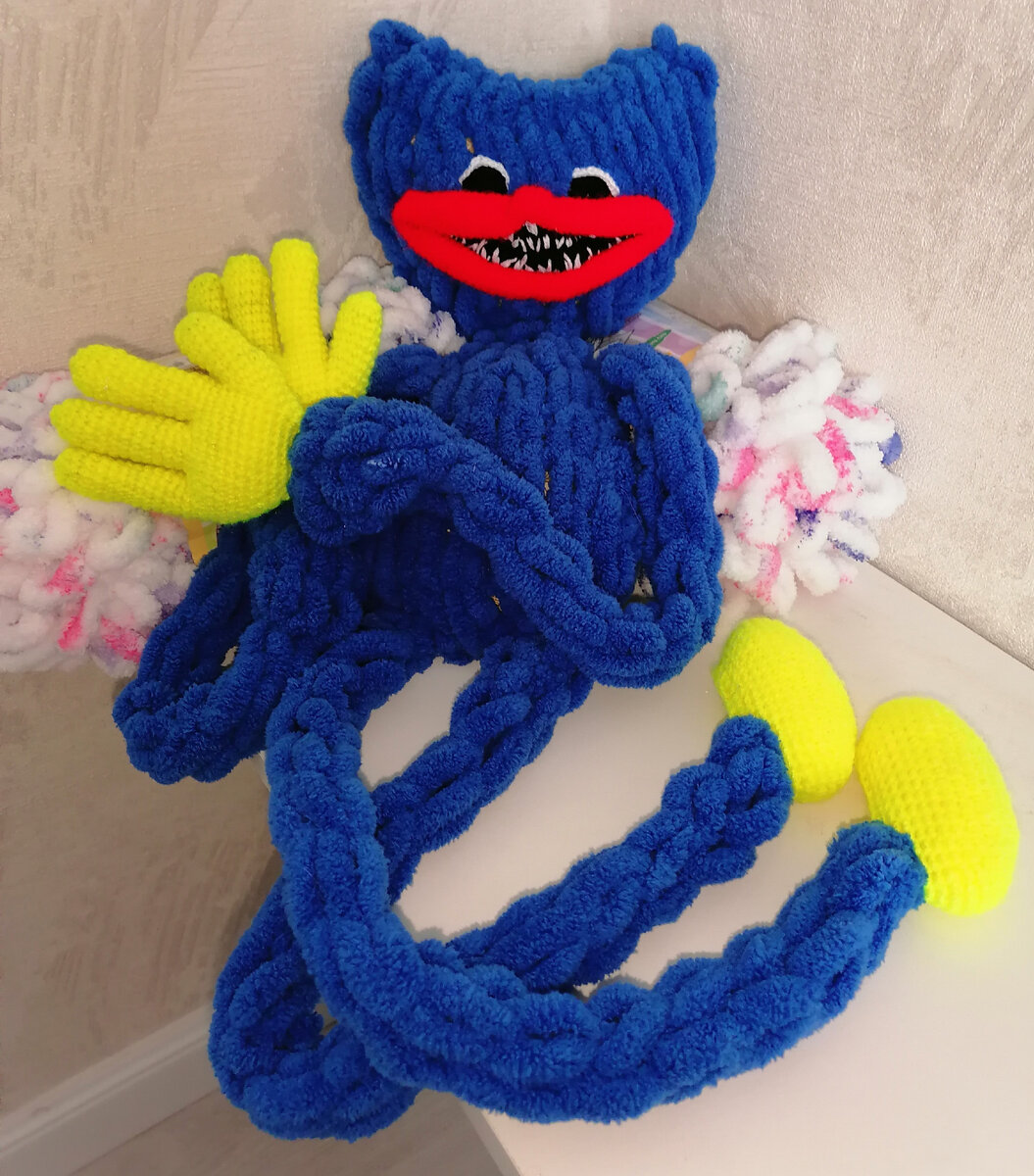 Сегодня вас ждёт рассказ о сотворении чудища. У кого есть детки или внуки имеющие гаджеты, те, наверное, уже слышали о прекрасном Хагги Ваги. Я долго не могла принять этого красавца, как увлечение моей дочери. Но увлечения ребёнка надо уважать и принимать. Когда они, конечно, не вредят здоровью и психике. Этого Хагги Ваги дочка слепила 10 раз из пластилина. Нарисовала раз 200 на бумаге. Нарисовала в планшете. И я сдалась. Начала думать из чего же его сделать. В этот момент у меня был заказ на пледик из ализе пуффи. Заказ был для малыша мальчика в васильковом цвете, именно такого цвета и Хагги Ваги. И меня озарило — вот из чего я его свяжу. На всю игрушку ушёл 1 моток пряжи Ализе Пуффи цвет 141 василек. Основание головы и туловища я сделала из ткани (обычный хлопок, какой был в запасах, но потом поняла, что нужно делать синий, т.к. просвечивается сквозь нитки), набила синтепоном. Далее начала обвязывать эти заготовки. Голову вязала от верха, постоянно прикладывая, как бы обвязывая по ф