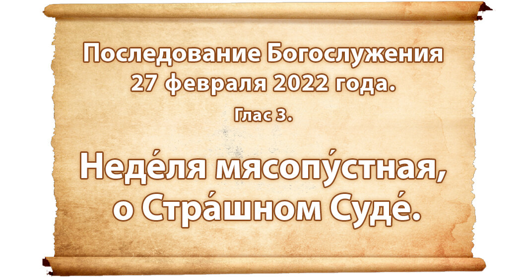 По ссылке на страницу последования богослужения можно скачать в разных форматах службу 27 февраля 2022 года: Неделя мясопустная, о Страшном Суде; глас 3