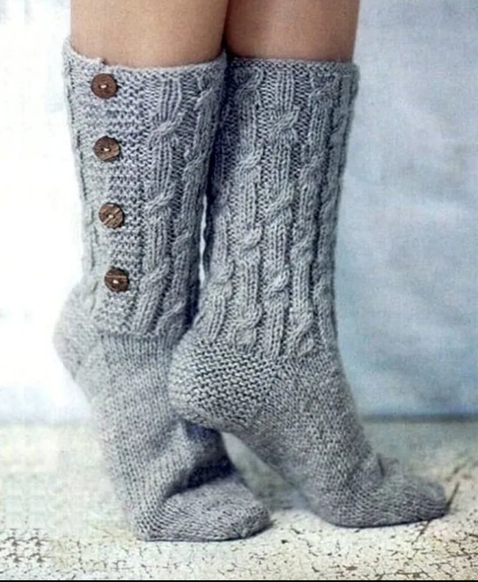 Носки на пуговицах Размеры: 30(38)42. Вам потребуются: Пряжа Novita 7 Veljesta (75% шерсть, 25% полиакрил, 100 м/50 г) -150(150)200 г светло-серого цвета 060. Прямые и носочные спицы №3,5. ~4,8 пуговиц. УЗОРЫ И ТЕХНИКИ ВЯЗАНИЯ Узор из кос: вязать по схеме. Повторять 1-16-й ряды. Платочная вязка: лиц. и изн. ряды — только лиц. петли. Лицевая гладь: при круговом вязании только лиц. петли. Плотность вязания: 21 п. лиц. глади = 10 см. ОПИСАНИЕ РАБОТЫ ЛЕВЫЙ НОСОК Наберите на прямые спицы 51(61)71 п., вяжите прямыми и обратными рядами 3 ряда платочной вязкой. Далее вяжите узором с косами следующим образом: провяжите первые 5 п. платочной вязкой, провяжите 1 п. перед раппортом, затем повторите 10 п. раппорта 4(5)6 раз, в конце провяжите еще 5 п. платочной вязкой. Продолжайте вязать петли узором из кос, провязывая крайние 5 п. с обеих сторон платочной вязкой для планок. Через 2 ряда вывяжите первую петлю для пуговицы по правому краю следующим образом: провяжите 1 лиц. п., 2 п. вме