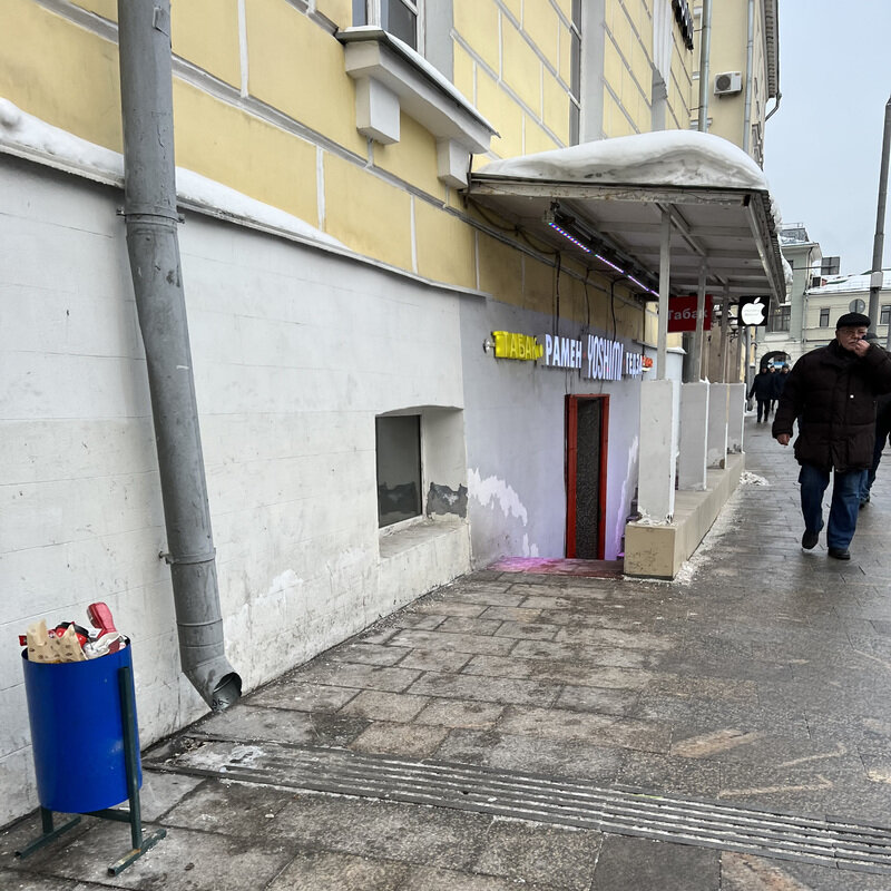 Меня же заинтересовал соседний спуск вниз – там, где на обшарпанной серой стене красуются несколько надписей, включая «Табак», «Копирка» и название новой точки быстрого питания «Рамен Yoshimi Гёдза» от известного шеф-повара Кобаяши Кацухико. Кстати, с его творчеством я знаком давно; в послужном списке работа в таких проектах, как «Недальний Восток», Madame Wong, собственные два Corner Café & Kitchen, «Киану», Izumi и Hachiko. Вход – две дешевые старые двери, одна из них вообще без ручек, пришлось толкать.