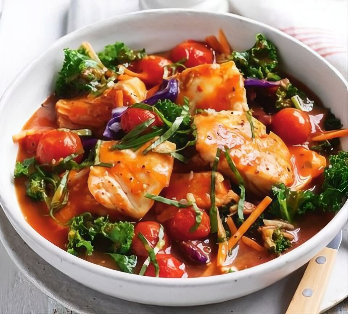 Морковь и лук очистите, вымойте, нарежьте ломтиками и каждый из них разрежьте на четыре части. Рыбу очистите от костей и кожи, сполосните в холодной проточной воде, нарежьте небольшими кусочками, соедините их с овощами, добавьте стакан горячей воды, растительное масло, лавровый лист, выложите в кастрюлю, закройте крышкой и тушите 40 минут на слабом огне. Крышка должна быть обязательно плотно закрыта. В качестве гарнира можно подать отварной картофель, зеленый консервированный горошек.