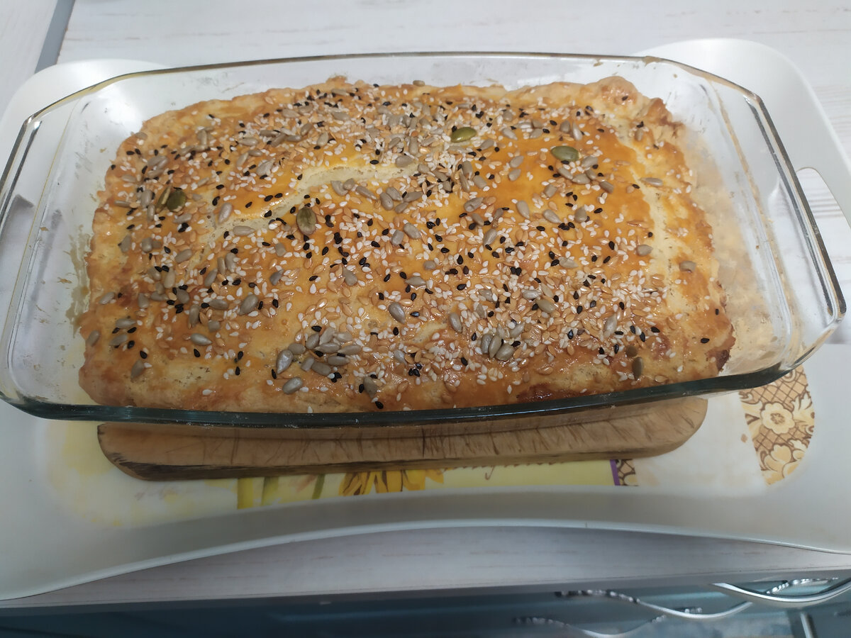 Добрый день! Решила опять побаловать свою семью, а заодно и попробовать новый для меня рецепт. Для теста понадобилось 100 - 125 г маргарина или сливочного масла, 3 ст. л. сметаны, 1 стакан муки, 0,5 ч. л. соды Маргарин натираем на крупной терке. Он должен быть замороженный, чтобы удобнее было тереть. К маргарину добавляем сметану, соду, гашенную уксусом, перемешиваем. Всыпаем просеянную муку, вымешиваем тесто. Скатываем тесто в колобок, убираем в холодильник. Для начинки: 2 луковицы, 3 яйца, 2 плавленых сырка, зелень любую по вкусу (у меня это своя замороженная зелень - лук + руккола + петрушка), 1 яйцо для смазывания Режем и обжариваем лук. Сырки натираем на крупной терке. Яйца взбиваем, перемешиваем с зеленью и сырками, добавляем лук. Форму для выпечки смазываем растительным маслом. Достаем тесто из холодильника, делим на 2 неравные части. Из большей формируем дно пирога с бортиками. Выкладываем начинку. Раскатываем меньшую часть теста и накрываем пирог, защипывая края. Смазываем пир
