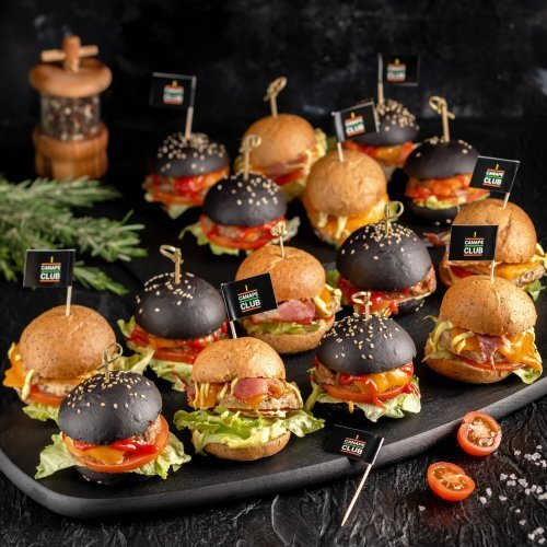 Думаете, как оригинально поздравить своих коллег на 23 февраля? Уверяем, что небольшой корпоратив с сытными «мужскими» закусками порадует мужскую часть коллектива больше, чем любые подарки в стиле 23 февраля 🧦😏 А если еда будет необычной и красивой, у вас получится устроить настоящий праздник! 🎉🍾 Промокод DZEN10 дает скидку 10% на любые блюда. Конечно, стоит отдать предпочтение блюдам из мяса. Поставьте на стол несколько разных сытных мясных закусок вместо привычных шашлыков. Мы предлагаем несколько вариантов порционных блюд, каждое из которых станет еще и украшением стола: Американская классика в формате «мини», при котором бургеры не разваливаются, а рубашки остаются чистыми 😄 В нашем меню вы найдете более 20 видов этой сытной закуски, а также комбо-наборы с мини-бургерами. 👉 Перейти в раздел - Мини-бургеры Самая популярная закуска на фуршетном столе - канапе - также может быть вполне сытной. Как вариант «Канапе Мини-бургеры» и «Деревенский сет» в нашем меню: Необычный спосо