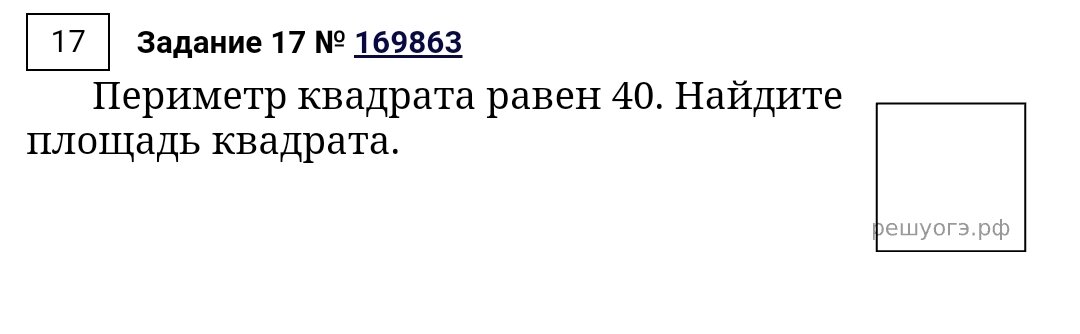 Дан периметр квадрата. Нужно найти площадь. Как находится периметр? Нужно одну сторону его умножить на 4. Т.е. нужно 40:4=10. Это одна сторона. Как находится площадь? Нужно возвести одну сторону в квадрат. Т.е. 10×10=100. Ответ: 100