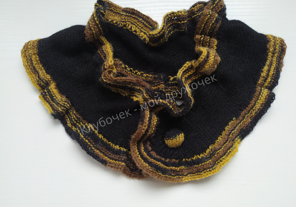 Наберите на спицы 5 петель (сюда входят две кромочные) и вяжите лицевой гладью. В каждом нечётном ряду с обеих сторон прибавляйте по одной петле. Одну после кромочной петли, вторую перед кромочной петлёй. В следующих рядах провязывайте их скрещенными петлями, чтобы не было дырок. Когда на спице будет 17 петель, необходимо провязать по прямой приблизительно 50 см. Затем начать убавление в каждом нечётном ряду, провязывая по 2 петли вместе после кромочной и перед кромочной петлёй. Когда на спице останется 5 петель, закройте их. Далее на круговые спицы по кругу наберите петли для волана. Чтобы волан получился красивый, из каждой петли набирайте по три (1лиц, накид, 1 лиц). После набора вяжите волан платочной вязкой. Чтобы воротник получился более красивым, волан и пуговицу свяжите другим цветом. Один круг волана вяжите лицевыми петлями, следующий – изнаночными петлями и т.д. (около 2,5 см). Затем все петли закройте. Соедините оба конца воротника и пришейте пуговицу. Пуговицу возьмите д