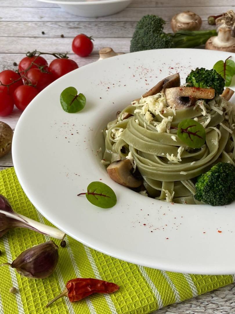 ✔️Зелёная (Pasta Tagliatelle verdi Теглиателли со шпинатом) почти идентична традиционной по размеру. Ключевым отличием является использование шпината. Паста выделяется цветом, вкусом и даже универсальностью, так как хорошо сочетается с легкими и сливочными соусами. ✔️Паста с грибами и брокколи под сливочным соусом готовится максимально быстро. ✔️При приготовлении такой пасты обжарить грибы и брокколи. Именно обжарка (а не тушение) лучше раскроет эти ингредиенты и подарит готовому блюду более ярко выраженный вкус. ✔️Сливки обязательно должны быть от 20% жирности и выше, чтобы они не свернулись при термообработке. ✔️Паста может быть любого вида из твёрдых сортов пшеницы. #игры #паста #макароны #домашняяеда #едаялюблютебя Ингредиенты: — Паста, — Грибы шампиньоны, Капуста брокколи — несколько соцветий, — Лук белый, — Чеснок, — Оливковое масло, — Сливочное масло, — Прованские травы, Соль по-вкусу, — Сливки 20%, Сыр пармезан или моцарелла Способ приготовления: Макароны варить по инструкции в