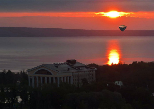 Следующей ночью жители города стали свидетелями необычного зрелища: на высоте не более мили над городом медленно проплывал огромный корабль. Его верхняя часть была классической летающей тарелкой, а вот нижняя - представляла собой почти стометровую усеченную четырёхгранную пирамиду. Корабль неторопливо сделал несколько кругов над городом, иногда замирая на одном месте на несколько минут .