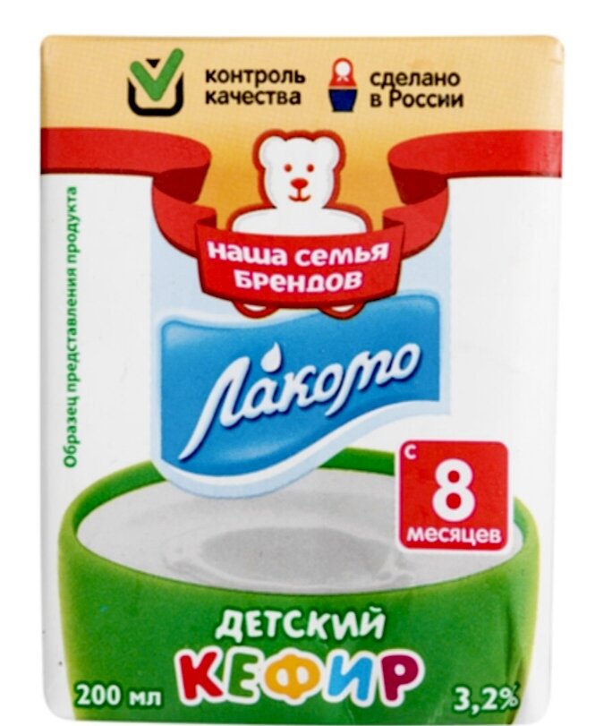 Кефир для питания детей раннего возраста, с массовой долей жира 3,2%, торговой марки "Лакомо" произведён АО "Зеленодольский молочноперерабатывающий комбинат" в России. Образец был приобретен в магазине "Ашан" по адресу: г. Москва, ул. Вавилова, д. 3.