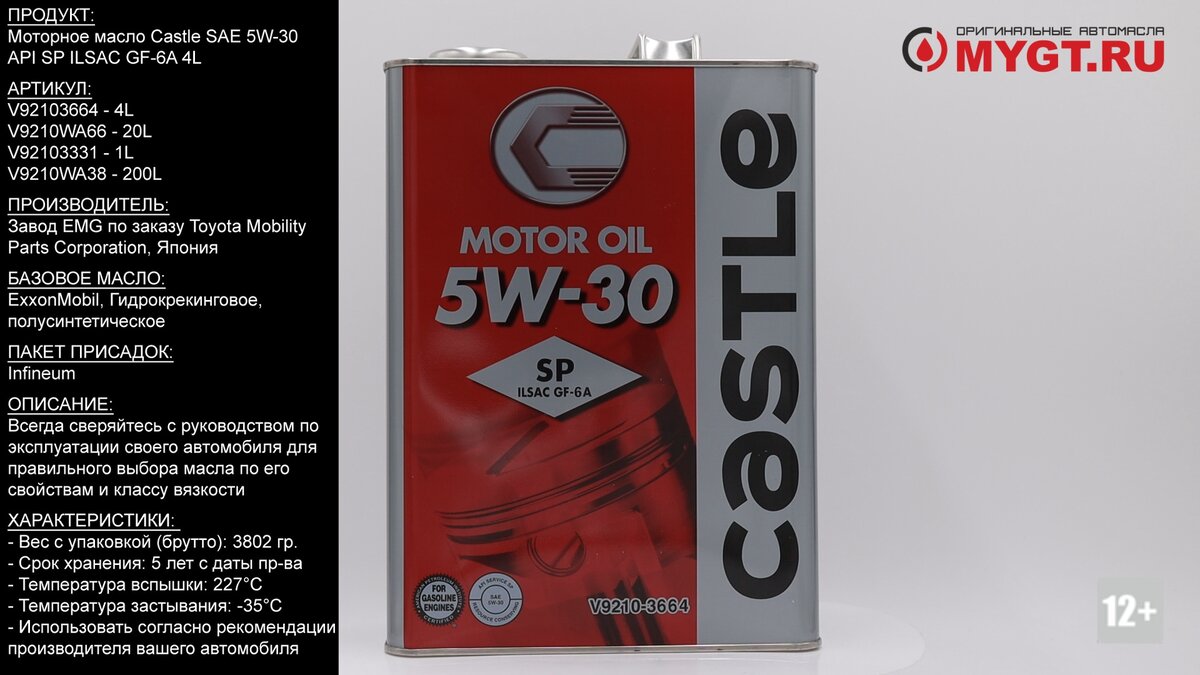 Продукт: Моторное масло Castle SAE 5W-30 API SP ILSAC GF-6A 4L Наш телефон: 8-800-550-57-22 ПН-ПТ 9.00-17.00 (МСК+4) Артикул: V92103664 - 4L V9210WA66 - 20L V92103331 - 1L V9210WA38 - 200L Аналог: 08880-10703 (08880-13703) Toyota Производитель: Завод EMG по заказу Toyota Mobility Parts Corporation, Япония Базовое масло: ExxonMobil, Гидрокрекинговое, полусинтетическое. Пакет присадок: Infineum Ссылка для покупки: https://mygt.ru/oil/castle/castle-sncf-5w-30-4-l.htmlАналог Toyota 08880-10705: https://mygt.ru/oil/original-oils-Japan/toyota-sngf-5-5w-30-4-l.html Особенности: Данный продукт выпускается мощностях ENEOS HOLDINGS, там же, где производится оригинальные автомасла и жидкости Toyota и предназначен для сети афтермаркета и дилерских центров Toyota в Японии. Бренд Castle принадлежит Toyota Mobility Parts - это дочерняя компания корпорации Toyota. Не смотря на тесную связь с Toyota продукция Castle может использоваться для любых японских корейских и европейск