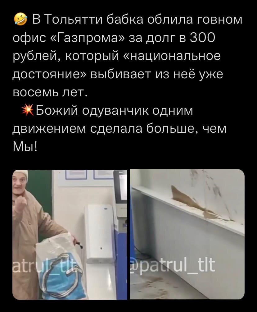 В ленте твиттера снова информационный взрыв. Некая бабушка из Тольятти, 8 лет не могла оплатить долг перед банком в 300 рублей, всего 300 рублей!!!(стоимость двух чашек кофе). Так вот, на днях она пришла в офис банка, разлила внутри помещения какие-то фекалии и тут же стала народным героем! Обратите внимание, на этот скриншот, который я сделал в твиттере Автор этого поста пишет, что она: «одним движением сделала больше, чем Мы!» Я посоветовал тому автору взять свои экскременты и не отставать от бабули, раз уж она сделала «больше чем Он». Но если серьезно, откуда у людей такое восхищение такими постыдными делами? Только не нужно начинать обвинять банки и другие финансовые учреждения во всех смертных грехах. На протяжении многих столетий во всём мире существуют банки и финансовые учреждения. Сегодня, именно благодаря банковской деятельности и развитию финансовых инструментов мы не только можем совершать покупки напрямую из других стран, оплачивать услуги, в том числе и коммунальные пла