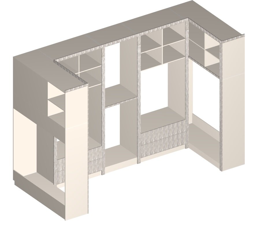 Любое наполнение шкафа - это сочетание стеллажей, каждый из которых можно собрать отдельно от отведенной ниши и "задвинуть" в нужное место.