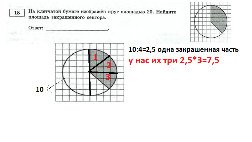На клетчатой бумаге изображен круг площадью 20. Найдите площадь закрашенного сектора