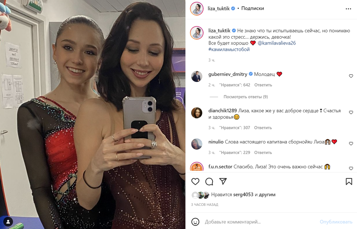 К счастью, у нас достаточно много адекватных людей, которые поддержали Камилу Валиеву и заступились за нашу спортсменку. Ситуация с допинг-пробами всё ещё остаётся не ясной, но радует одно - Камила все же сможет выступить в личном турнире. В инстаграме появился хеш-тег #камиламыстобой и любой желающий может послать фигуристке свои лучи поддержки. Приятно видеть, что Камилу Валиеву поддерживают все, начиная от фигуристов и заканчивая политиками. Очень приятно, что Камилу поддержала и Елизавета Туктамышева, которая тоже могла выступить на этой Олимпиаде, но не смогла показать чистые прокаты на чемпионате России. "Не знаю что ты испытываешь сейчас, но понимаю какой это стресс… держись, девочка!" Евгения Медведева, которая сейчас присутствуют в составе нашей делегации в Пекине написала, что уже поддержала Камилу и сказала ей все слова поддержки при личной встречи. Также, двукратная чемпионка мира попросила журналистов не публиковать недостоверную информацию. Какую только информацию от ж