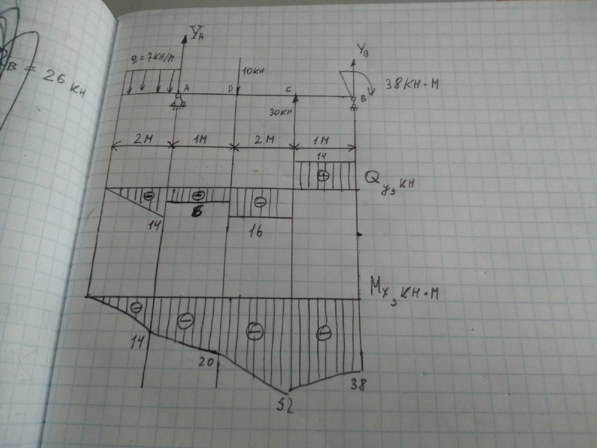 ( Если сила крутит балку по часовой стрелке, то она идет со знаком +, если против часовой, то с минусом) Важно отметить, что эта кривая в 38 Кн*м — уже момент. Его мы ни на что не умножаем, а просто складываем, учитывая куда направлены стрелки, относительно точки. После получения огромного выражения, мы выражаем реакцию Yв, и ищем ее. Затем также в точку В и делаем тоже самое. Получив 2 значение реакций стержней выполняем проверку. Сумма всех сил должна быть равна нулю. Шаг третий: Эпюра Qy. Найдя реакции стержней и проверив, все ли верно, мы строим эпюру Qy: Строим таким о