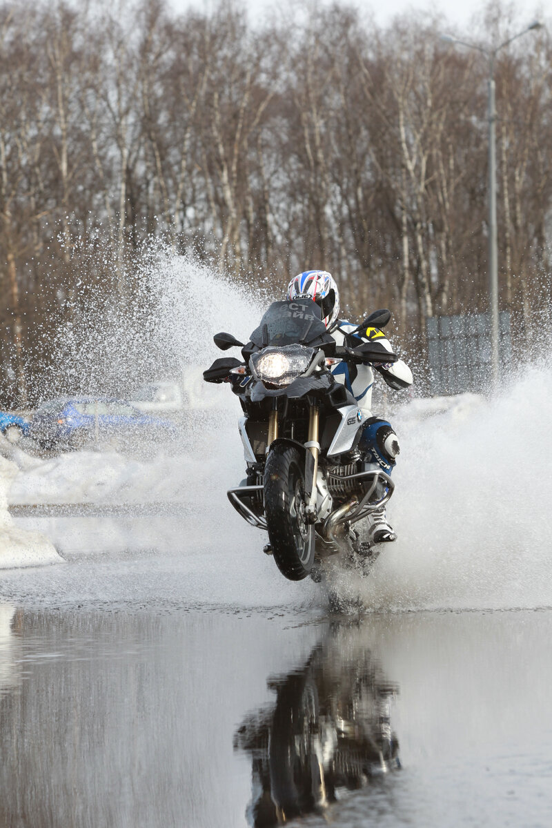 В движении все бумажные выкладки подтвердились с первых же метров: двигатель действительно стал «богаче» —практически в каждом пункте мотоцикл пусть и немного, но превзошел предыдущую модель. Скажу больше: лично мне режима Dynamic хватило буквально на первых трех километрах теста —исключительно для понимания сути процесса. В дальнейшем большую часть времени на приборной панели отображался режим Road: та же мощность, но без «истерики». То же могу сказать и про Rain и про Enduro —еще плавнее, еще предсказуемее, но практически без потери в максимальных цифрах лошадиных сил. Общие впечатления от динамки заметно превосходят «добавку» в мощности на бумаге. Конечно, писать о том, что теперь можно почем зря надругаться над любым спортбайкером, я не буду (хотя, собственно, именно физически надругаться можно —весь вопрос лишь в весогабаритных показателях пилота… в своем большинстве владельцы «гусей» — отнюдь не худосочные спортбайкеры, страдающие от могучего солитера…), но «приехать» до 100 км/ч в районе четырех секунд вполне возможно (естественно, с отключенной ASC). Заметно расширился «динамический коридор» после 150 км/ч: даже на шестой передаче потенциала двигателя хватает для того, чтобы легко довести спидометр до 200 км/ч! После этих цифр предшественник уже заметно «сдувался», в то время как нынешний GS всё еще бодрится, начиная подавать признаки усталости лишь после 220 км/ч. Говорить о максимальном пределе с точностью до 1 км/ч сложно, но на стенде получились весьма впечатляющие 238 км/ч! Конечно, стенд не учитывает аэродинамические потери, но, согласитесь, для туристического эндуро весьма впечатляющий показатель. Великолепно работающая тормозная система с непременной ABS непостижимым образом стала еще лучше и точнее. Впрочем, в этой категории у BMW почти никогда не было серьезных конкурентов. Возможно, для серьезного бездорожья, для которого, как мы все знаем, этот мотоцикл не приспособлен, тормоза могут показаться излишне «чувствительными», но с другой стороны — пользователю пока еще предлагается возможность полностью отключить систему… Немного о комфорте. Очевидно, что новейшую модификацию долго и скрупулезно «дули» в аэродинамической трубе. В результате, несмотря на очень скромные во время теста +3 °С, я не чувствовал никакого дискомфорта, а регулируемое одним движением руки ветровое стекло позволило выбрать оптимальный вариант ветрозащиты именно под меня. Подвески, даже без Dynamic ESA, без разбора «глотали» почти всё, что я им предложил, включая «гребенку» разбитого после зимы подмосковного асфальта, и даже справились с небольшой лестницей. Впрочем, в свое время баварская компания задала такие стандарты комфорта, что чего-то другого от R1200GS уже и не ждешь, и такая «всеядность» подвески воспринимается как должное.