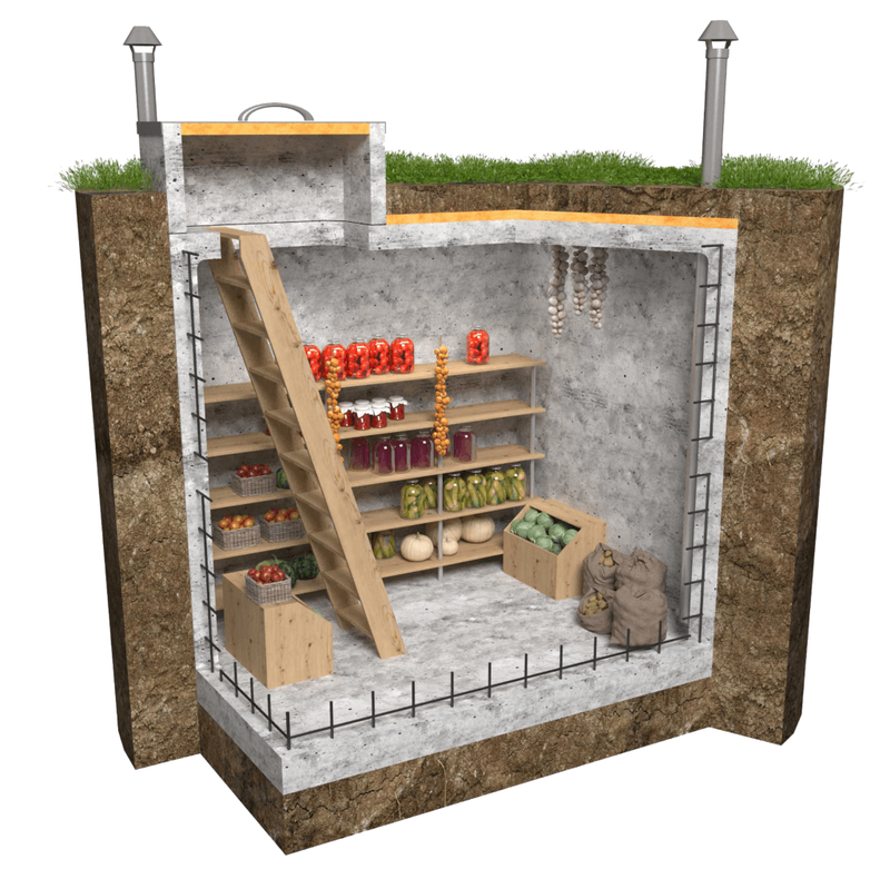 Таким образом, средняя глубина погреба под домом составляет от 2 м. геотермальное тепло здесь сохраняется в полном объеме. В помещении может быть, даже, слишком тепло для корнеплодов. Картошка и морковь начинают прорастать. Требуется принудительная вентиляция для отведения тепла.