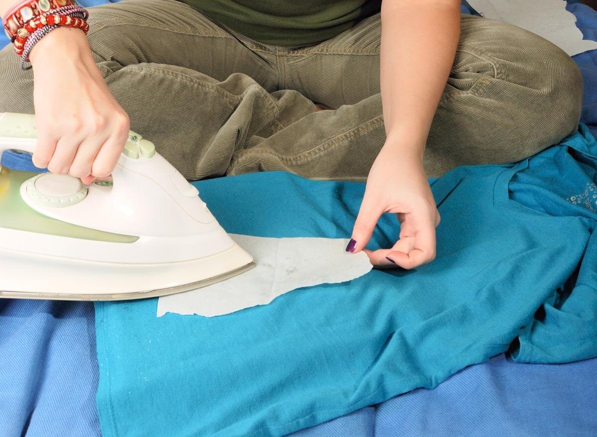 • Накройте пятно бумажными полотенцами и, используя самую низкую температуру утюга, осторожно прогладьте участок. Тепло от утюга должно впитать пятно в бумажные полотенца.