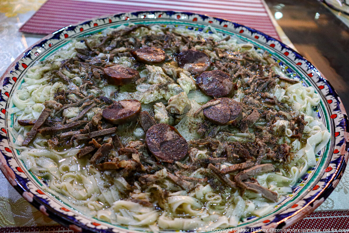 Кстати, по поводу самого повара: при приготовлении бешбармака их всегда минимум двое. Мужчина нарезает мясо, а женщина — отваривает лапшу: разделение обязанностей строгое.