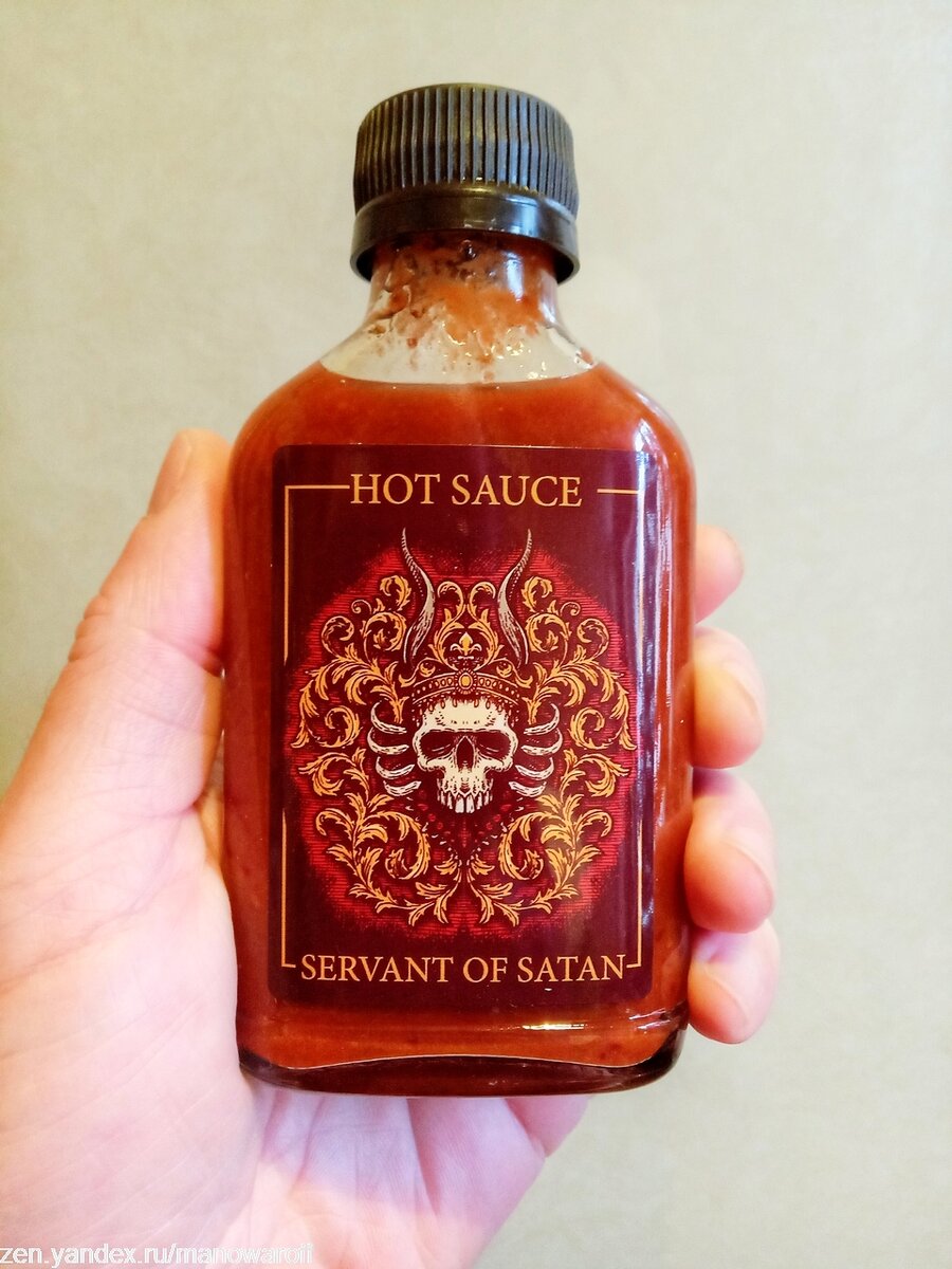 В виде острого соуса Servant of Satan, созданного питерской пивоварней HopHead Brewery. Да-да, ребята не только пиво варят, но и делают отличные, судя по всему, соусы. Впрочем, насчет отличных - это мое предположение, которое я сегодня и проверю. В составе данного соуса целая куча перцев-миллионников, т.е. острота который от миллиона Сковиллей и выше. А в целом сегодняшний соус выдает 800 000 SHU. Настолько острого соуса мне еще не доводилось пробовать. Предыдущий, Скорпион, был 600 000 Сковиллей. Хотя, сдается мне, что после какого-то определенного уровня остроты рецепторы перестают ощущать ее степень. Впрочем, посмотрим. Соус красный, достаточно жидкий, с мелкими кусочками перцев. Аромат перцово-фруктовый, приятный. Вкус аналогичный, сладковатый, с легкой кислинкой. Затем приходит она - мощная острота, заглушающая собой все привкусы. Но, что интересно, жжет она не особо долго, и это хорошо. А то потом сидеть еще минут 15-20 с горящим ртом не в кайф - даже горячего чая не попьешь. У