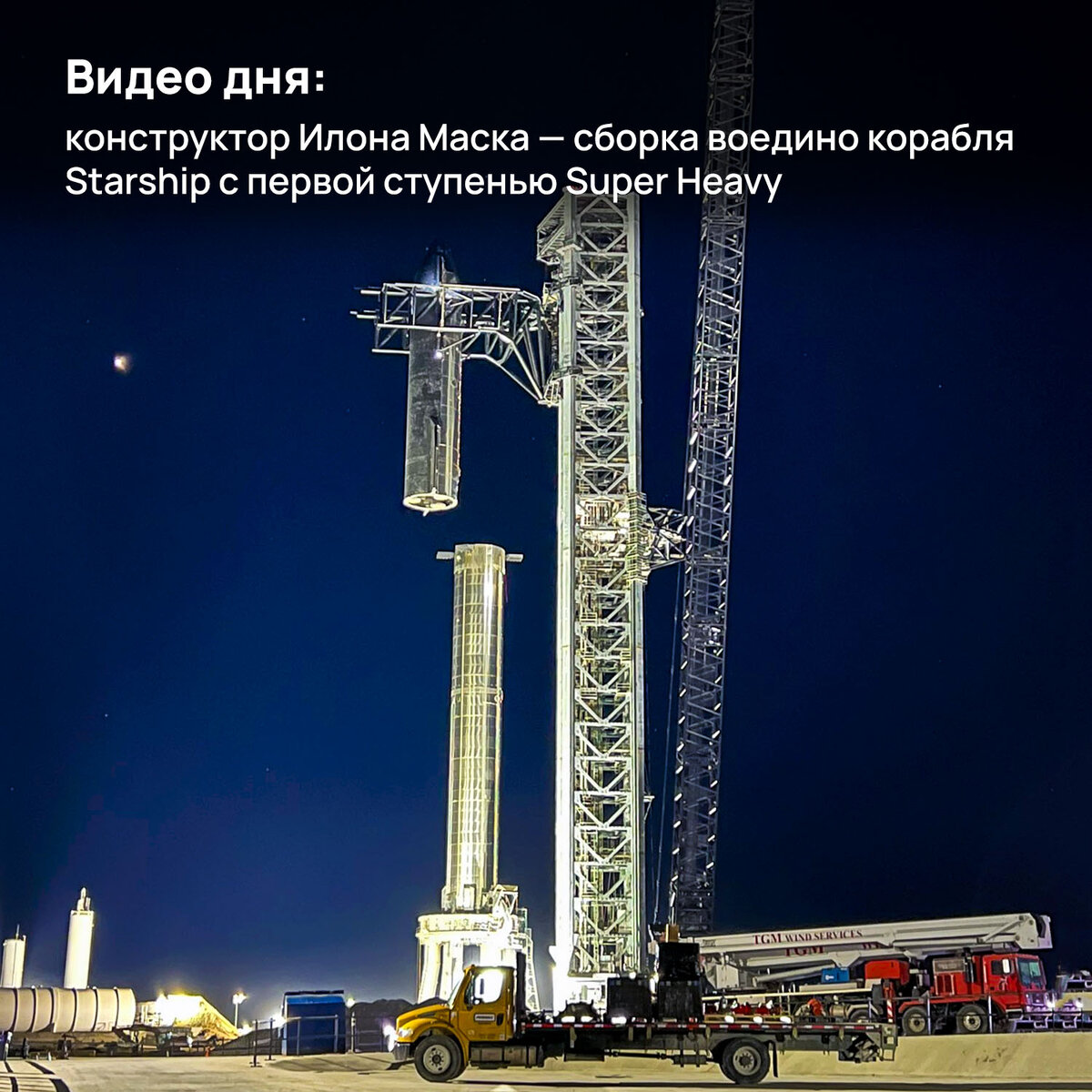 10 февраля 2022 года на площадке Starbase в Техасе давали техническое шоу: проходила сборка ракеты Starship. Канал NASASpaceflight опубликовал почти трёхчасовое видео, как именно это происходило, а в своём твиттере дал занимательный таймлапс процесса. Три часа сжали до 15 секунд. На видео отчётливо видны светлые точки, летающие около корабля — это дроны, которые контролировали процесс сборки с разных точек обзора. SpaceX реализовала прототип ракеты Starship — прототип корабля Starship 20 был успешно собран воедино с прототипом первой ступени Super Heavy 4. Их общая высота составила 120 метров. В сборке участвовала «Мехазилла» — 140-метровая башня обслуживания Starship. Именно «Мехазилла» будет ловить многоразовую первую ступень Super Heavy после возврата в атмосферу.