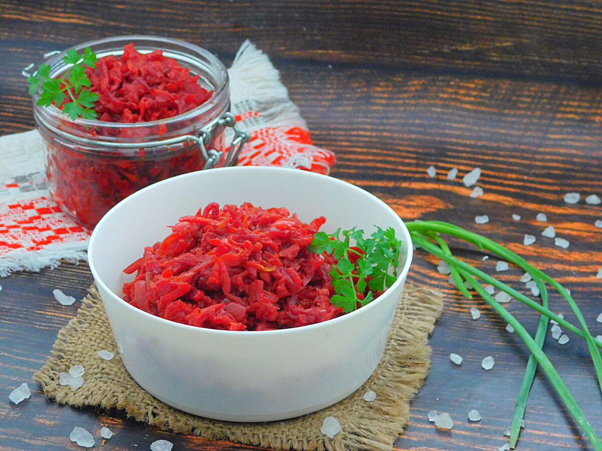 Любите борщ, но не хочется тратить много времени на его приготовление? Тогда сделайте полезную заготовку, предлагаем вашему вниманию рецепт борщевой заправки. С ней приготовить вкусный наваристый борщ не составит особого труда. Из данного количества ингредиентов получилось две порции из расчета, если использовать каждую на 2-литровую кастрюлю супа. Время приготовления: 40 минут. Количество порций: 2. Этапы приготовления: 1. Подготовить все необходимое. Овощи очистить, в ингредиентах вес указан в очищенном виде. 2. Морковку натереть на корейской терке и выложить на разогретую с маслом сковороду. Обжарить две минуты до мягкости, высыпать небольшие кубики лука. 3. Жарить все вместе на среднем огне до легкой золотистости. Добавить тертую свеклу. Огонь уменьшить и тушить овощи под крышкой 30 минут, периодически перемешивая. 4. Ввести томатную пасту и столовый уксус. Вместо пасты можно использовать свежие томаты, очистив их от кожицы, но в этом случае надо будет потушить заправку подольше,