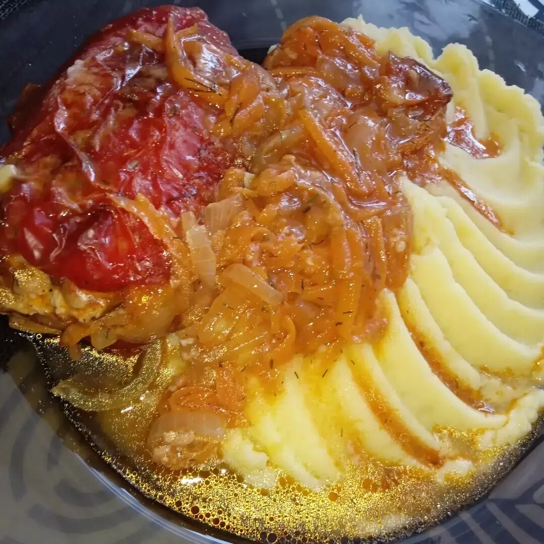 Ингредиенты: Перец крупный, фарш, отваренного риса, лук, соль, перец чёрный молотый, морковь, лук для соуса, мука, томат, вода, соль, перец чёрны, хмели-сунели, лавровый лист, картофельное пюре, масло растительное Способ приготовления: Смешивает фарш, рис, соль, перец. Очищенные перцы наполняет фаршем (мои перцы были приготовлены в прок в заморозке). Обжариваем лук, морковь. Перекладывать в пережарку перцы. В воде разводом специи, муку, томат, заливаем перец и жарим в духовке при 180 гр 50 мин.