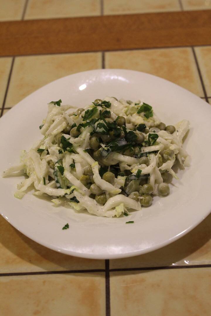 Для любителей пекинской капусты, да и просто для тех, кто любит лёгкие и простые салаты ☺️ Рецепт создался случайно, приготовила из того, что было в холодильнике, но результат получился очень вкусным 👍🏼. Ингредиенты: пекинской капусты, большой огурец, консервированного горошка, майонеза, греческого йогурта, петрушка, соль, чёрный перец Способ приготовления: Капусту тонко нашинковать, огурцы нарезать соломкой, петрушку мелко нарубить, добавить горошек, посолить, поперчить. Смешать майонез и йогурт, заправить салат. Приятного аппетита 🌸.