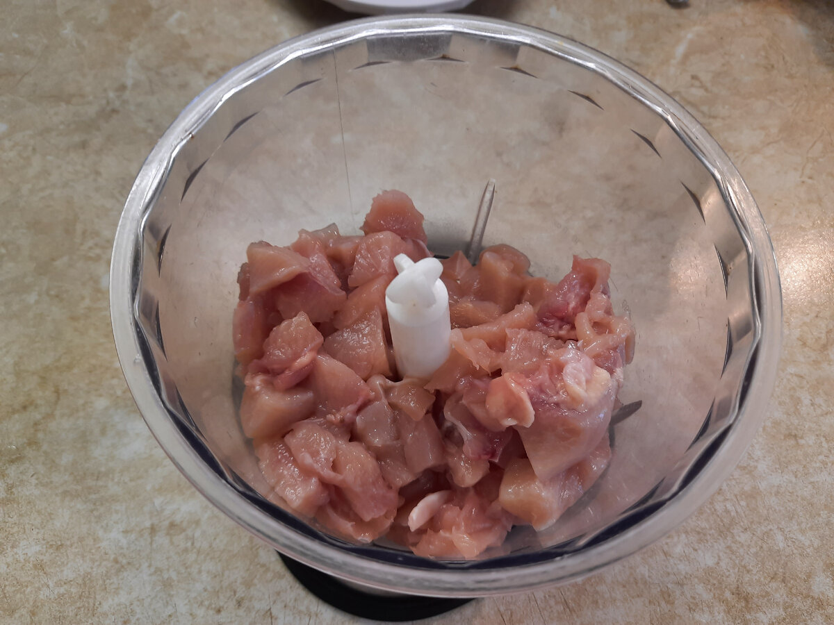 Творог детский сметанообразный - 100 гр Готовим: Грудку куриную нарезать на мелкий кубик и отправить в чашу блендера. Туда же отправляем творог (я еще добавила немного сушеного чеснока прям чуть-чуть). Также, можно добавить сушеную петрушку по вкусу. Все хорошо "блендерим". Получается пастообразный фарш. Дно чаши в мультиварки смазать р