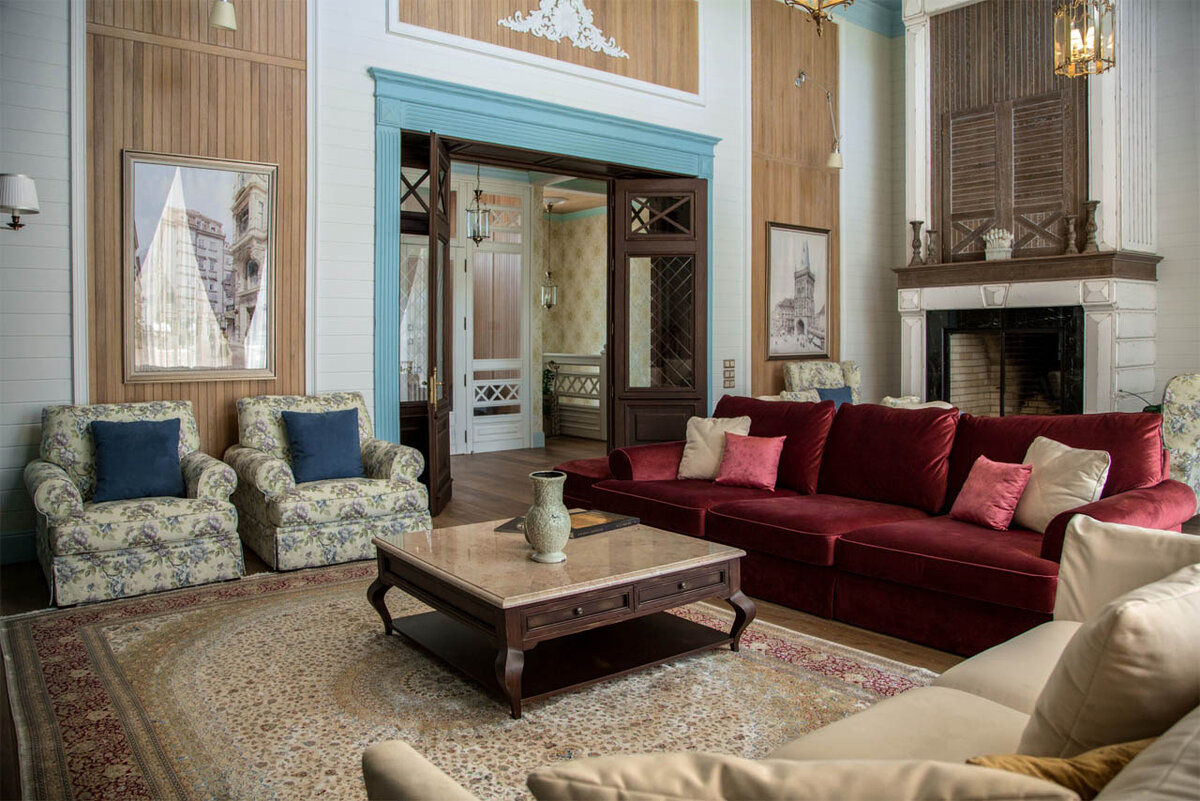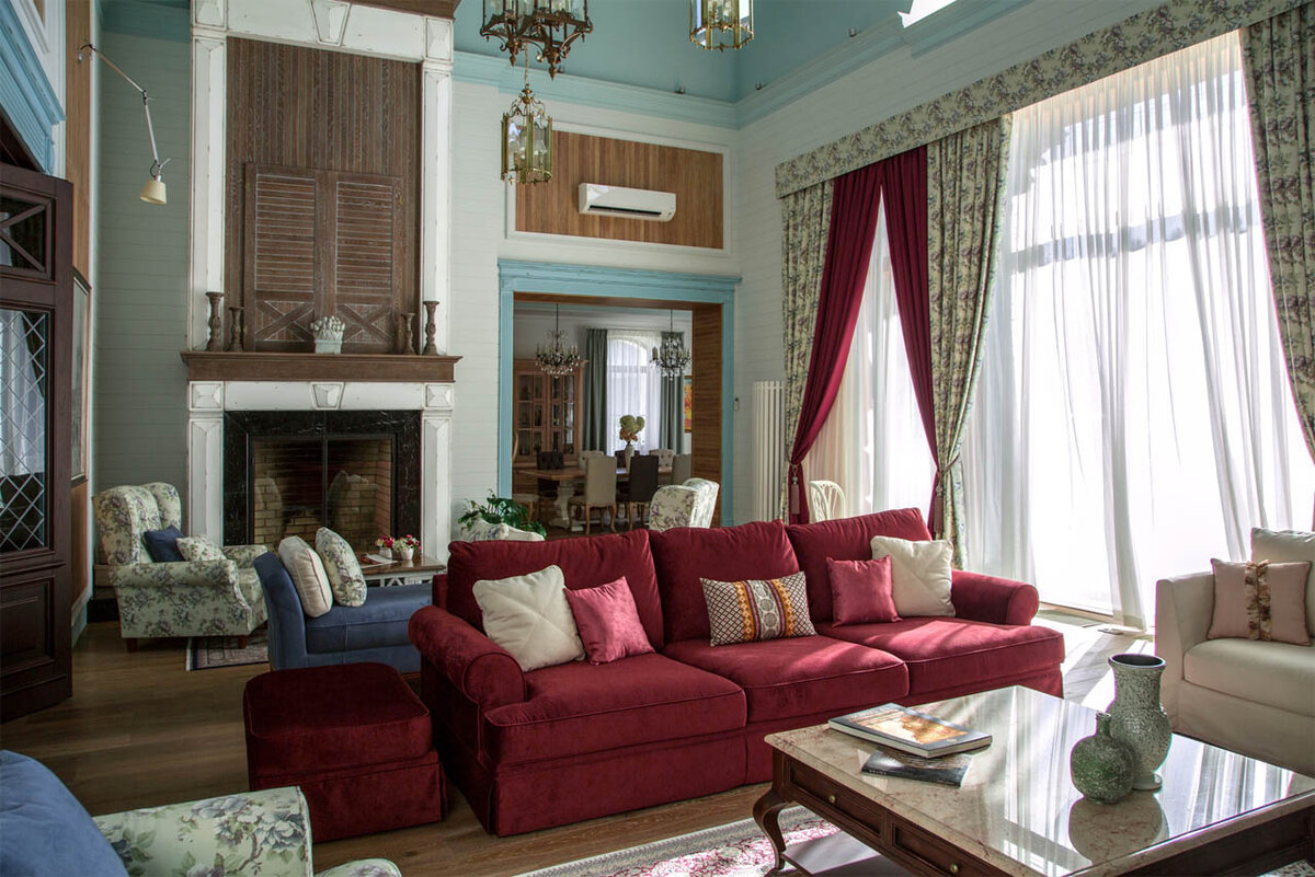 Дизайнеры создали очень добротный, респектабельный, полновесно звучащий интерьер, при этом подарив пространству и необходимую легкость, и нежные ноты, и особый уют, свойственный стилю ретро. Перед командой S.Y.D interiors studio стояла необычная задача: приехав на объект, они обнаружили, что практически весь интерьер уже был готов... Но заказчик принял кардинальное решение все переделать, выстроив принципиально новое пространство. Во многом залогом успеха стало то, что владелец дома, обсудив ключевые моменты, полностью доверился дизайнерам, и работа шла легко и слаженно. В доме проживают супруги с двумя детьми, поэтому пространство логично разделили на общественную и приватную территории. Сердцем дома стала двусветная гостиная – высота потолков здесь составляет около семи метров. Такое решение всегда выглядит очень эффектно и производит впечатление, но требует максимум внимания к пропорциям, композиции и наполнению комнаты: важно сохранить воздушность и подчеркнуть объем помещения, но