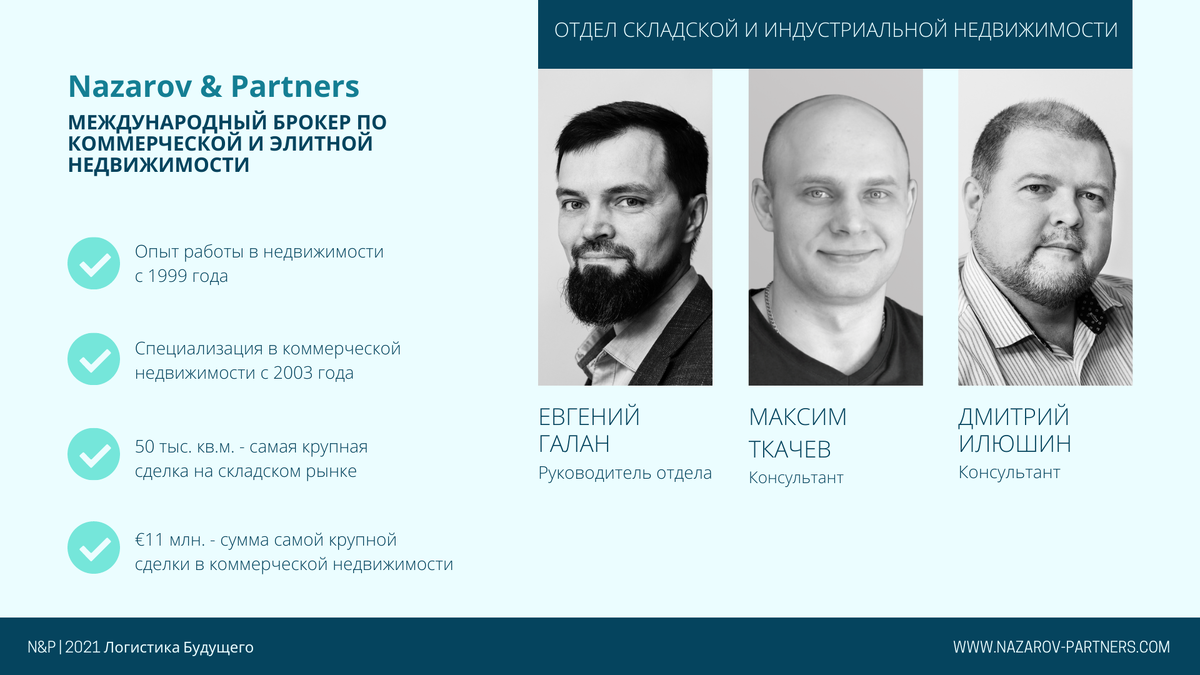Компания “Nazarov & Partners”, - мы 22 года существуем на рынке. Последние 17 лет специализируемся на коммерческой недвижимости. И пять лет из них очень активно развиваем направление индустриальной и складской недвижимости. Руководитель направления, Евгений Галан.