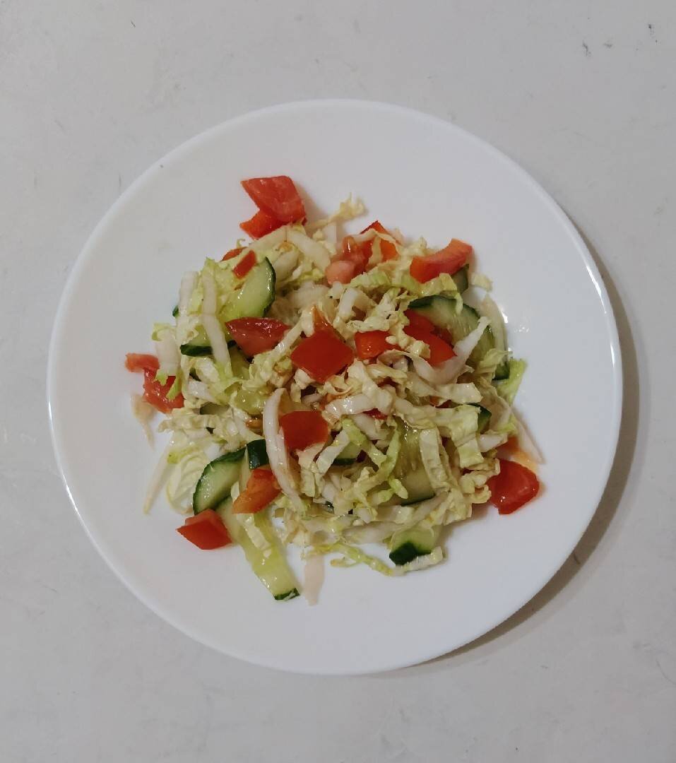 Ингредиенты: помидор, огурец, пекинская капуста, болгарский перец, зубчик чеснока, майонез (растительное масло), соль Способ приготовления: Нарезать кубиками помидор. Огурец нарезать соломкой. Перец болгарский нарезать также соломкой. Капусту пекинскую мелко порезать. Чеснок натереть на мелкой тёрке. Смешать все ингредиенты, посолить, заправить майонезом или растительным маслом.